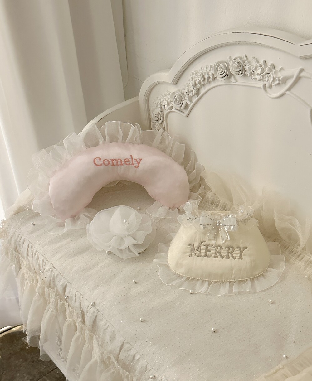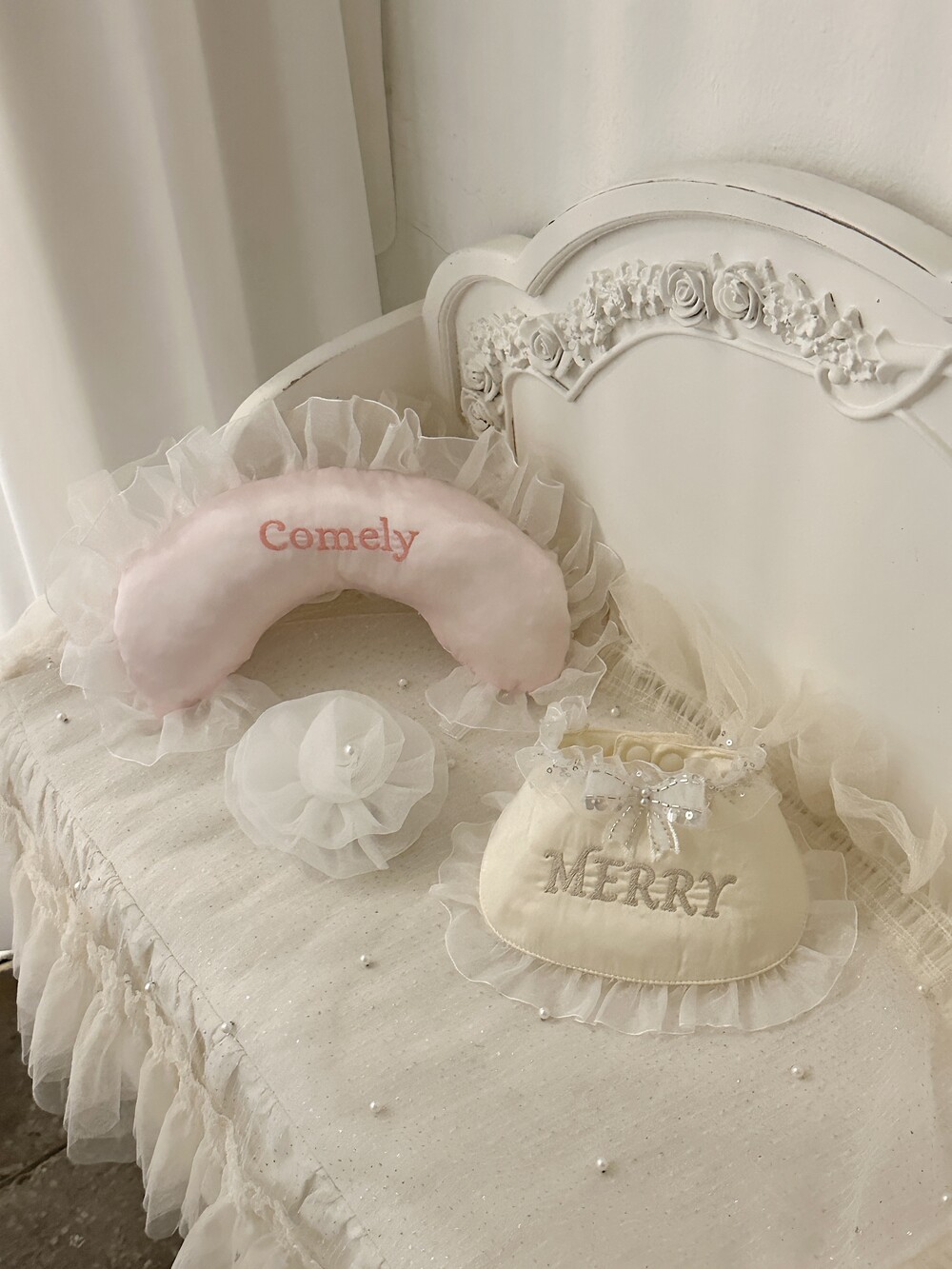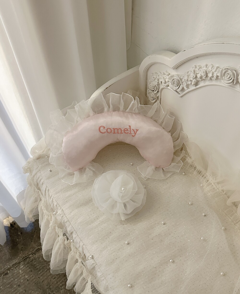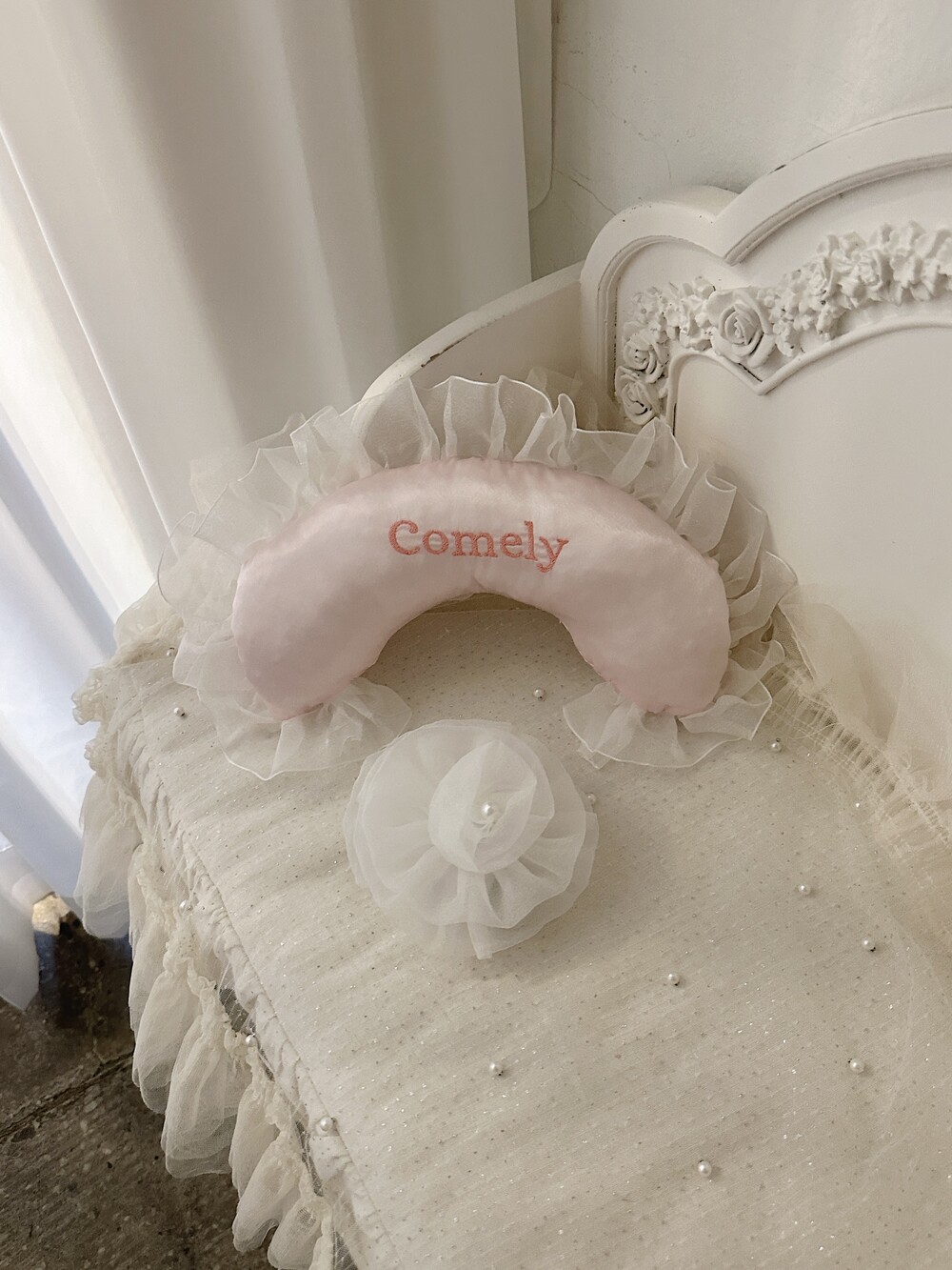 부드러운 새틴 원단 위에 사랑스러운 프릴을 더해 완성된 Satin Name Pillow 🎀
