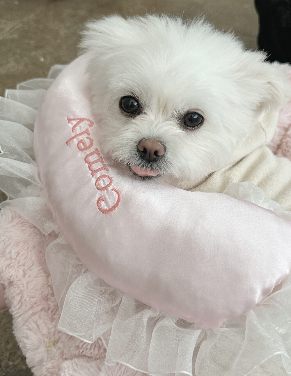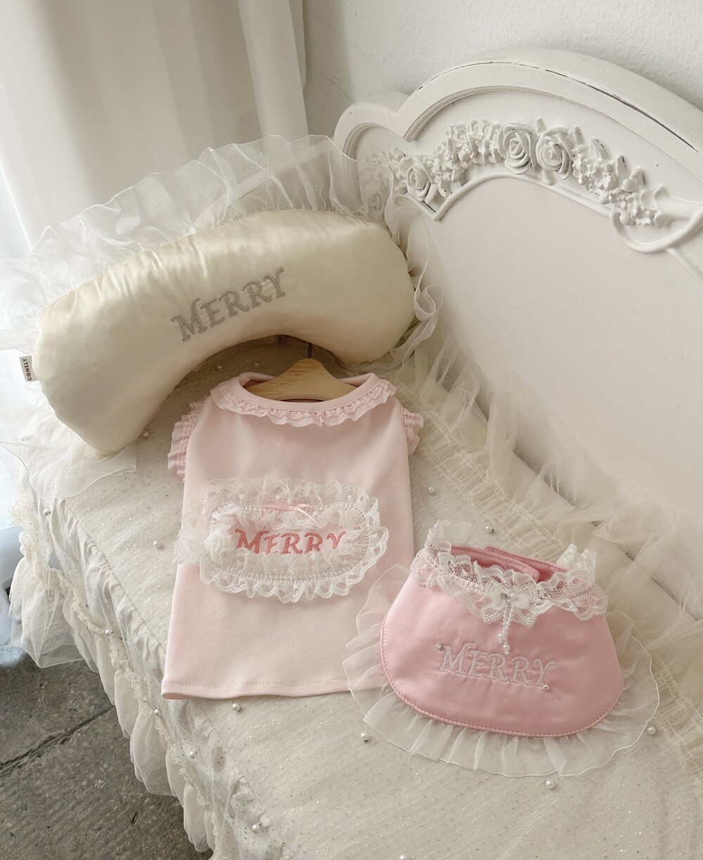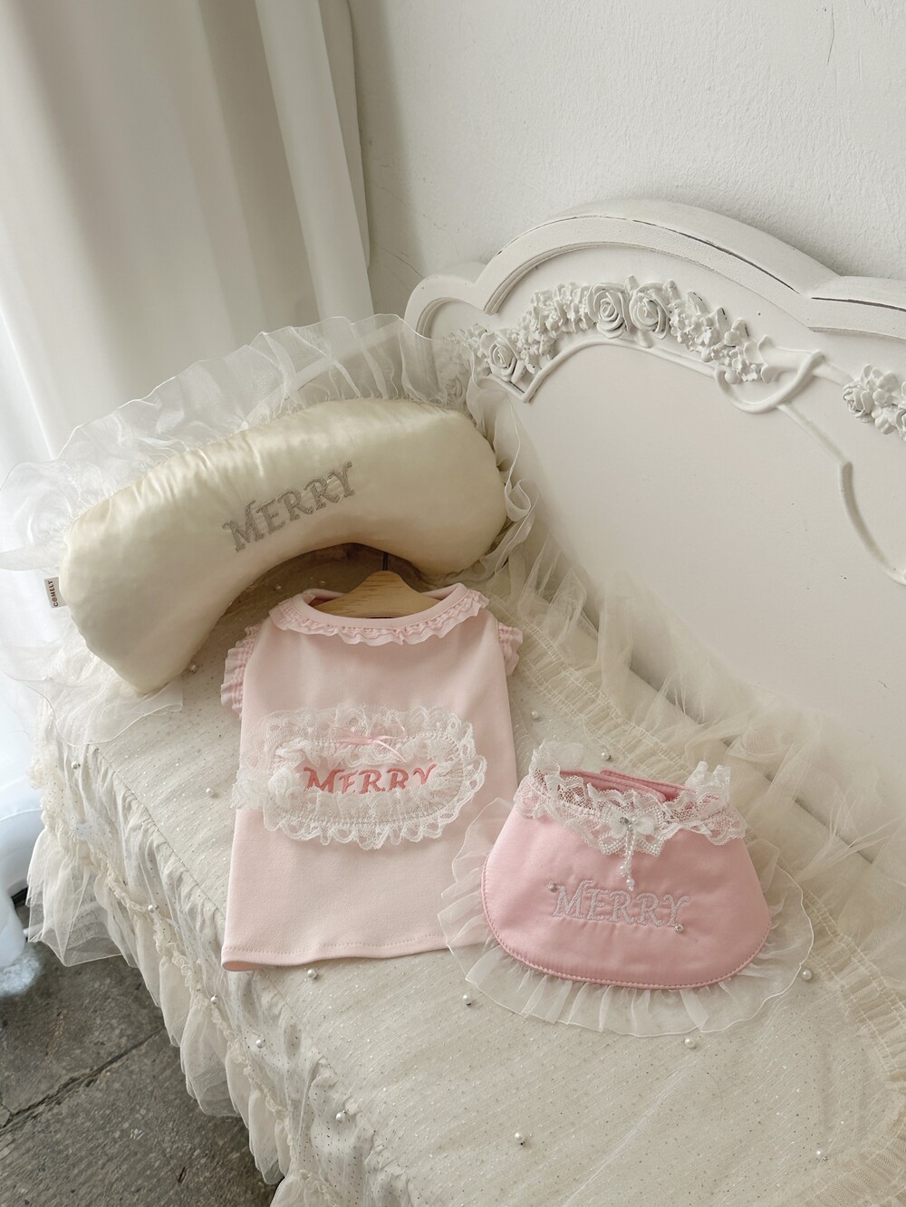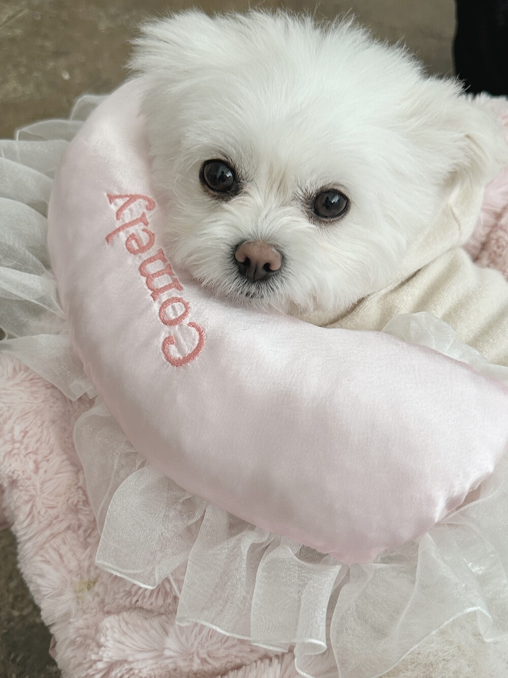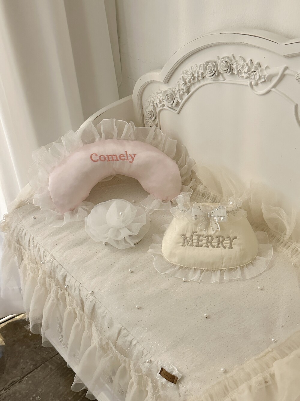 부드러운 새틴 원단 위에 사랑스러운 프릴을 더해 완성된 Satin Name Pillow 🎀