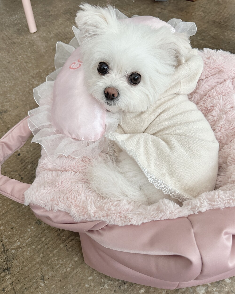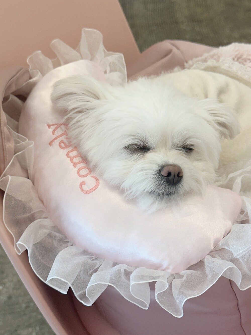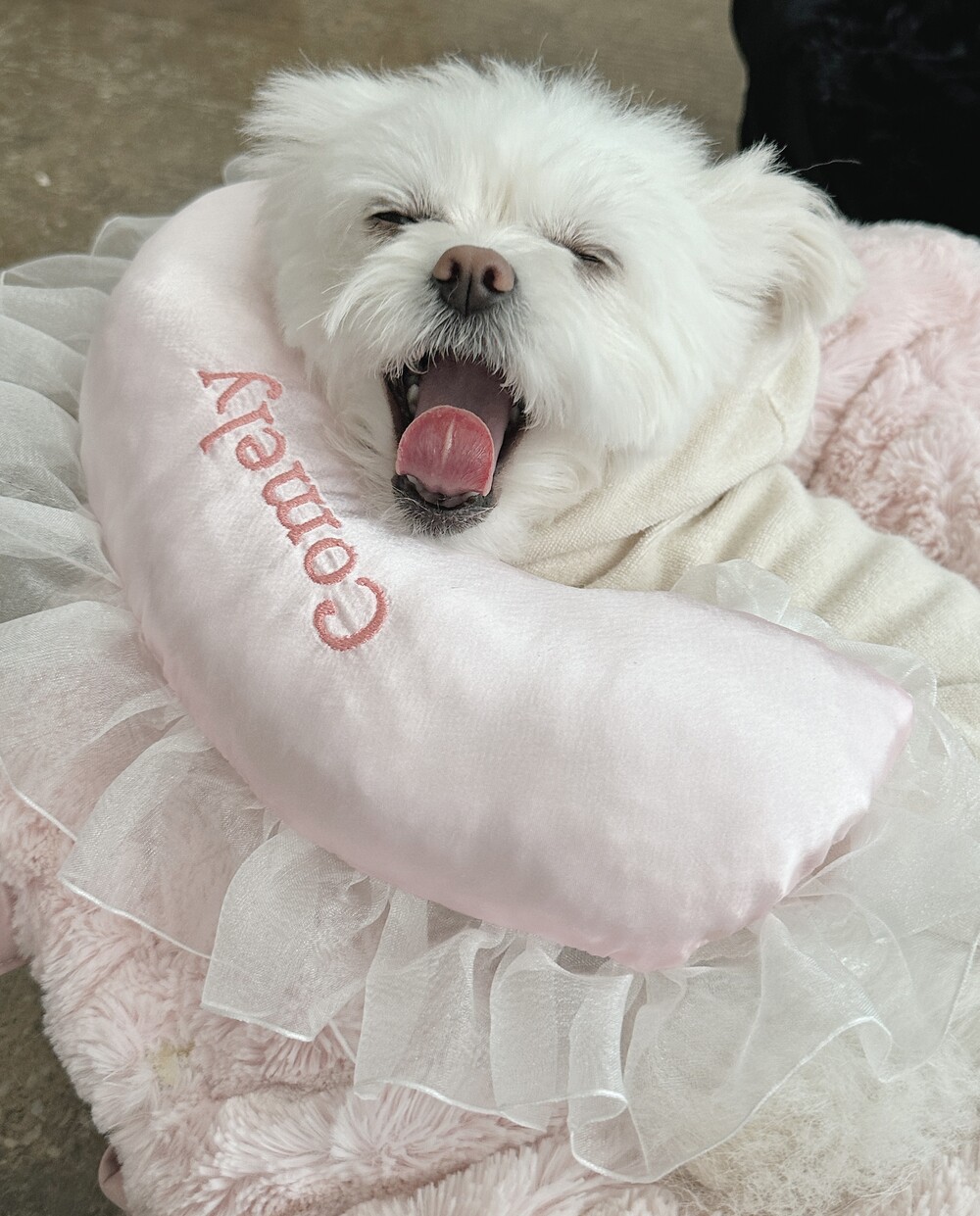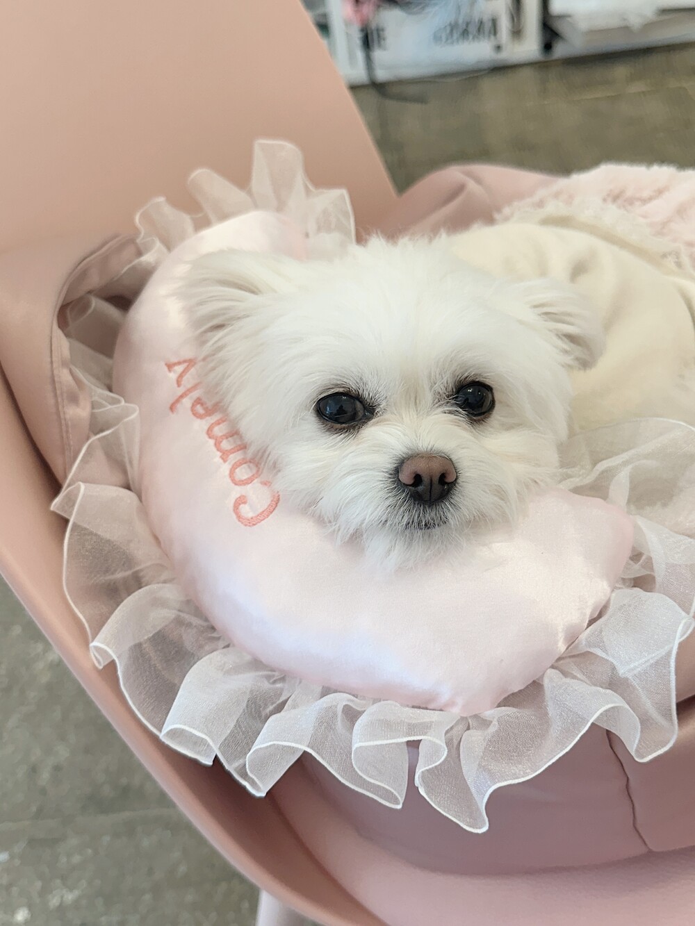 부드러운 새틴 원단 위에 사랑스러운 프릴을 더해 완성된 Satin Name Pillow 🎀